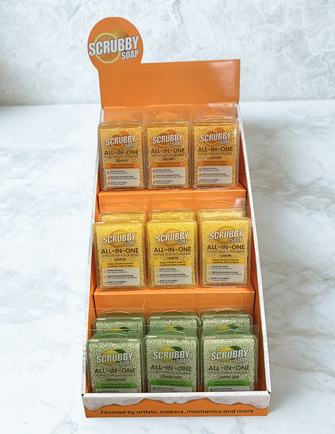 Elevate your retail space with our eye-catching Scrubby counter display. Featuring a tiered design, it showcases a variety of Scrubby soaps in a visually appealing way. Perfect for creating an engaging shopping atmosphere!